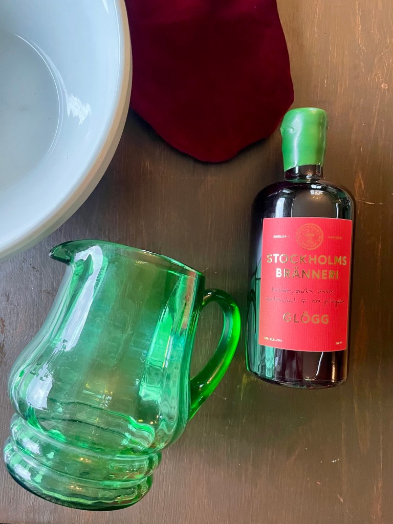 En kväll när jag låg i badet fick jag upp riktad reklam om att Stockholms bränneris glögg skulle släppas snart, jag drabbades av plötslig FOMO och innan badet var klart hade jag förhandsbeställt en flaska. Den var så fin att den får bli julaftonsglöggen. Samma dag som jag hittade spillkummen kom även denna ljuvliga handblåsta glaskanna in i mitt liv. Den ska absolut pryda julbordet, men eftersom jag älskar grönt glas kommer den med all säkerhet användas året runt.