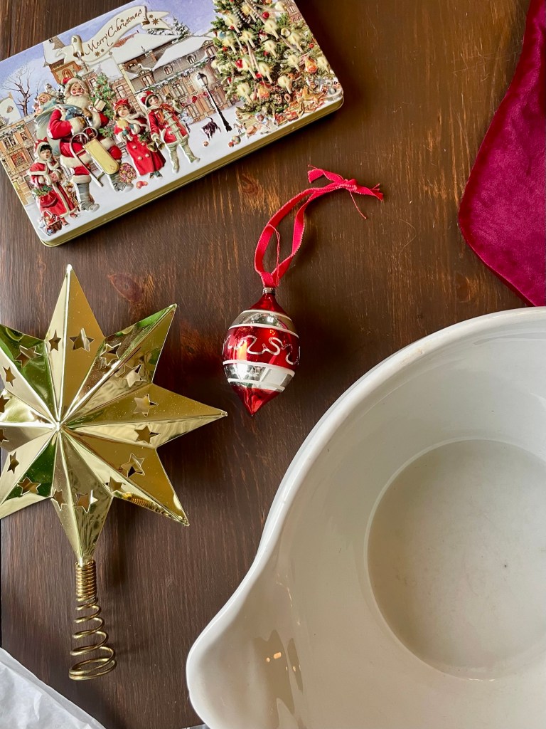 Först och främst hittade jag äntligen en vit spillkum i keramik på loppis. Vi har en här hemma och jag älskar den, så jag ville absolut ha en i husköket också. Denna är en gammal variant från Gustavsberg och på grund av en liten nagg i pipen kostade den 80kr på Lindra, väl värt. Egentligen är jag ju en spiratjej, men när denna toppstjärna i mässing uppenbarade sig på Stadsmissionen, med originalkartong och för 29kr, då kunde jag inte låta bli. Udda finkulor får också alltid följa med hem om de är rimligt prissatta, och det var denna. Plåtburken med julmotiv köpte jag ju i Ropsten förra veckan och däri tänkte jag lägga juletiketter eller dylikt platt.