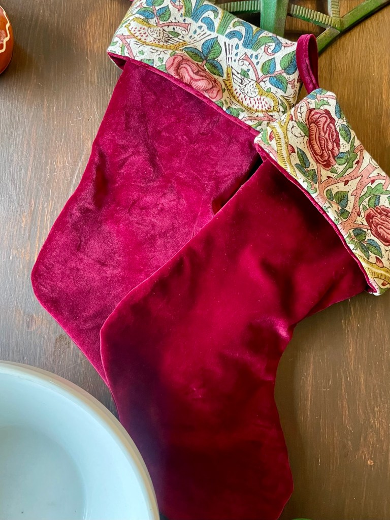 För ett par år sedan sydde jag ett par julstrumpor till mig och Fredde, men de blev himla små. Så när jag fick fick sammet över efter att jag klippt ut delarna till min blivande loungedräkt sydde jag två nya till oss, extra stora. Kanten är av en spillbit William Morris-tyg som jag hittat på loppis. Egentligen hade jag velat ha tvärtom, så att kanten kunde varit sammet med monogram, men det räckte inte Morris-tyget till. Hur som helst kommer de bli toppen i huset, särskilt om några år när det sitter WM-tapeter både här och där.